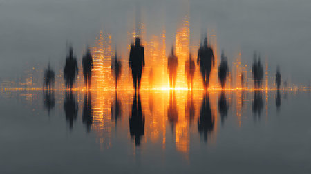 A unique generative illustration of a large group of people, created using artificial intelligence. Conveys the energy and movement of a busy square. Ideal for use in marketing materials
