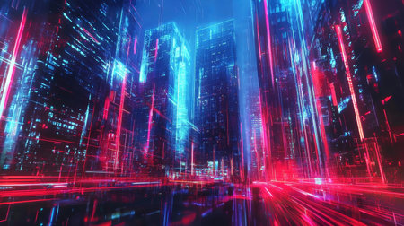Futuristic city skyline at night with towering skyscrapers neon lights and a glowing luminescent urban landscape Dramatic abstract and technologically advanced cityscape