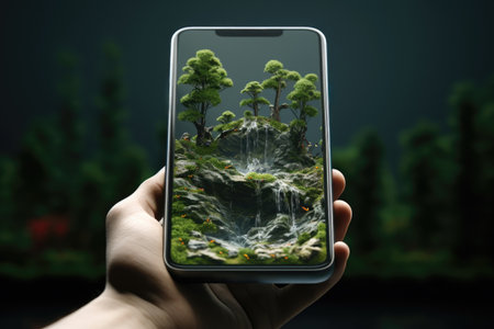 Smartphone in hand with a blurred background of a waterfall and plants. Virtual reality.