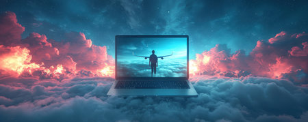 Surreal scene of a laptop with a figure walking among clouds