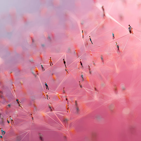 Numerous tiny figures are arranged within a complex web of connecting lines, primarily in shades of pink. The visual style appears to be conceptual, with a shallow depth of field blurring the background. The composition suggests a digital environment or network. This image could be used for illustrating concepts related to communication or abstract designs.