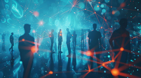 Abstract network of miniature people on a teal background, symbolizing connections and community, representing diverse cultures and emotions in a modern setting