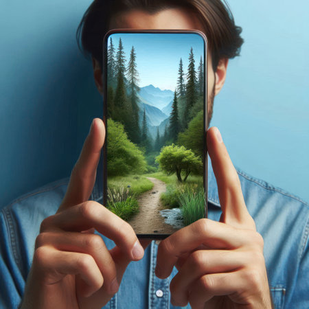 A forest trail on the screen of a smartphone held by a man