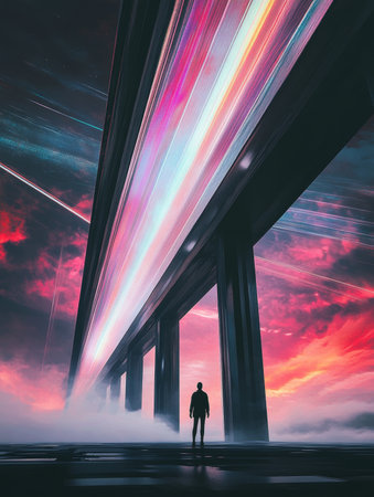 Solitary Figure Underneath Futuristic Bridge with Light Trails and Vibrant Sky, Surreal Cityscape