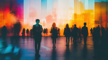 A group of people are standing in front of a colorful wall. The people are silhouetted against the wall, creating a sense of depth and movement