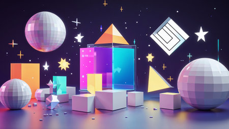 3d rendering of a colorful abstract composition with geometric shapes, low poly spheres, and stars, creating a futuristic and vibrant scene. Ai generated image