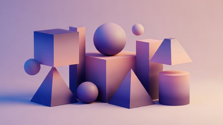 A still life composition of colorful 3D geometric shapes with smooth gradients, placed on a soft, light background.