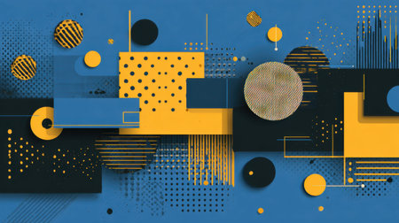 Vibrant abstract geometric artwork featuring a blend of blue and yellow shapes including circles and lines, perfect for modern design projects or creative backgrounds.
