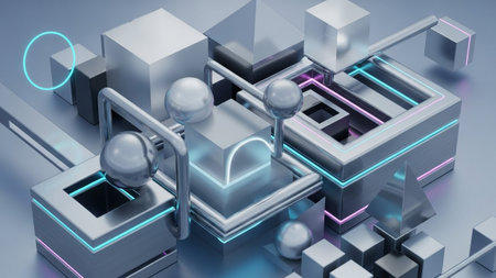 A geometric abstract composition of metallic shapes with glowing neon blue and pink light accents.