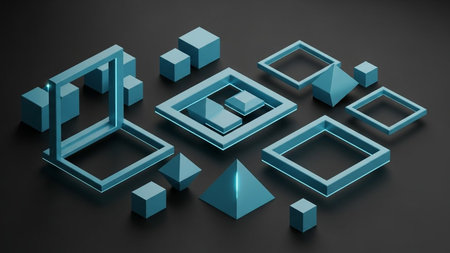 An orderly arrangement of minimalist 3D geometric shapes, including cubes, spheres, and pyramids, creates a modern and structured abstract background.