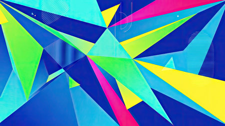 An abstract composition features a dynamic arrangement of colorful geometric shapes. Bold blue tones form a backdrop for overlapping triangles in yellow, green, and pink. The artwork's style suggests a digital origin, with high contrast and defined edges, suitable for various design applications.