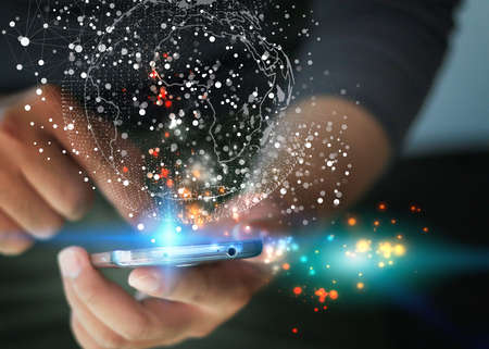 Close up of young man hand using global network app on a mobile phone with virtual screen background