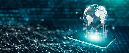 Digital and technology convergence with Globe on Mobile. Modern phone business, Smartphone Technology, and Modern communication technology Concept. 3D Render.