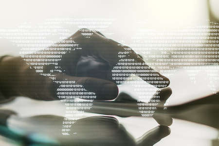 Multi exposure of abstract graphic coding sketch with world map on modern computer background, big data and networking concept