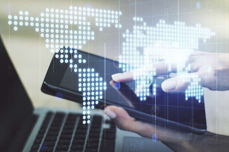 Multi exposure of abstract graphic world map and hand working with a digital tablet on background, big data and networking concept