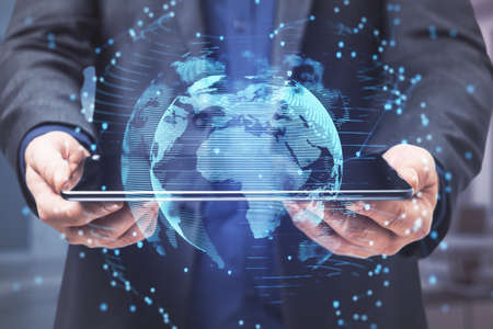 Businessman hand holding tablet with glowing blue globe on dark background, Global communication and business concept. Double exposure