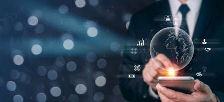 Businessman using smart phone to do online transactions with internet technology, concept of global data connection by internet technology, big data, searching for information, online marketing