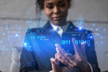 Businesswoman using phone, work in modern office on new project. Double exposure. Concept of success. World map planet earth hologram.