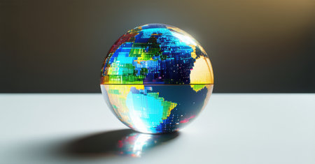 A crystal globe shines in red and blue light reflecting the continents with captivating detail.
