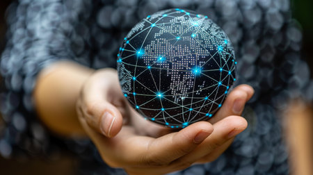 A human hand gently cradles a transparent, glowing blue globe, showcasing illuminated digital continents and intricate network lines across its surface.