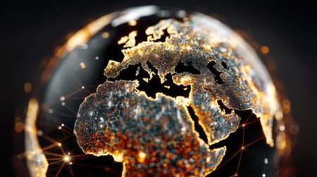 Glowing globe showcasing Europe and Africa, illuminated with vibrant lights and intricate details, representing global connectivity and technology. stunning visual of world