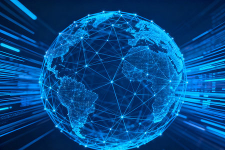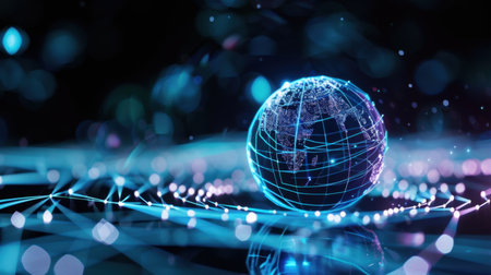 This captivating digital illustration showcases a globe interconnected with lines, embodying the essence of global connectivity and technological advancement.