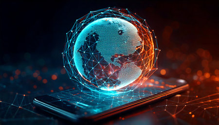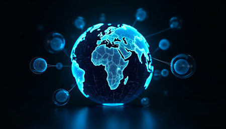 A high-tech holographic globe surrounded by digital network lines, symbolizing worldwide data flow.