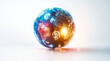 This digital globe features cryptocurrency symbols, representing the evolving financial landscape. It captures the essence of global connectivity and technology.