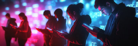Individuals have bowed heads as they focus on their smartphones amid glowing digital numbers, highlighting a sense of disconnection.