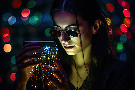 Mobile device illuminated in colorful reflections during a nighttime urban setting