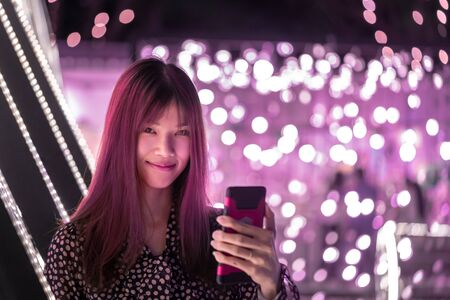 Portrait of a woman on blurry Bokeh light background in Outdoor Festive Market