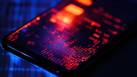 Phishing, cyber security, online information breach or identity theft crime concept. Hacked phone. Hacker and cellphone with hologram data. Mobile scam, fraud or crime. Cybersecurity infringement. --ar 16:9 Job ID: f69af913-261a-4c90-bab4-37fa554af6ac