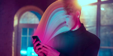 Cinematic portrait of stylish man in neon lighted interior using a smartphone. The face is smeared, sucked, absorbed into the screen. Concept of social network dependency, phone addiction.