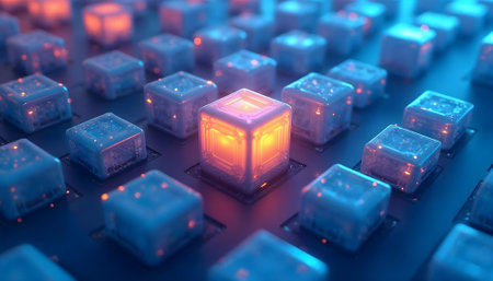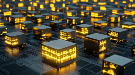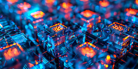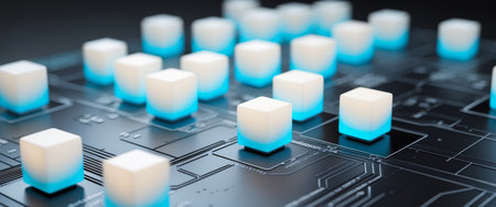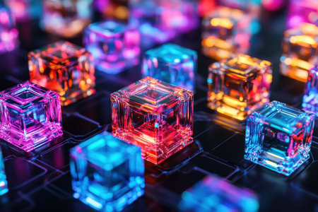 A captivating close-up of glowing digital cubes on a circuit board, symbolizing advanced technology in data processing and innovation in modern computing environments.