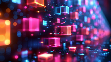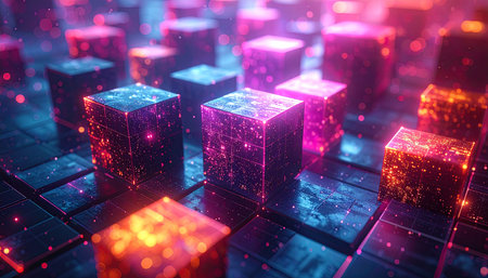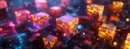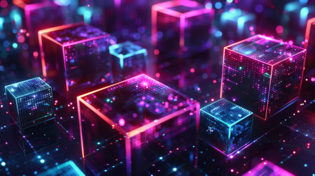 Vivid floating cubes of light illuminate a dark digital space, creating a mesmerizing atmosphere that evokes feelings of innovation and technology.
