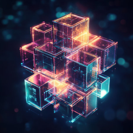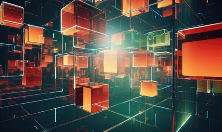 An artistic rendering of several translucent cubes floating in space, with vibrant colors and intricate details, creating a futuristic and abstract visual.