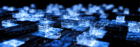 A digital scene features glowing blocks and intricate circuits against a dark background, representing advanced technology and innovation.