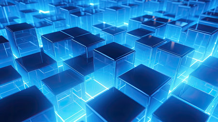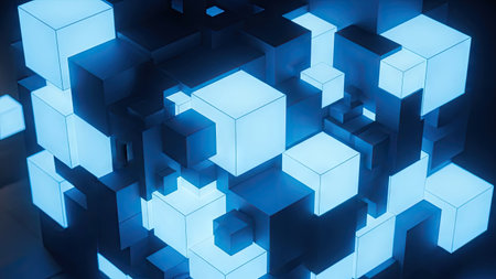 An abstract composition features numerous cubes of varying sizes and positions. These three-dimensional blocks emit a cool, blue glow, contrasted by darker surfaces. The modern style suggests a digital or technological theme. Suitable for illustrating concepts related to data, networks, or other commercial purposes.