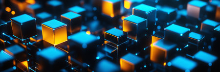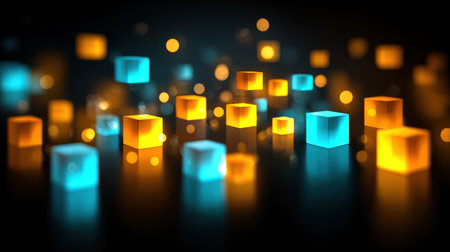 This image presents illuminated cubes in various sizes and colors, floating against a dark backdrop. The composition features vibrant orange and cyan hues, enhanced by a bokeh effect. It has a modern and dynamic aesthetic suitable for illustrations, digital media, or conceptual designs. Its uses range from marketing to website design.