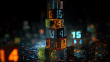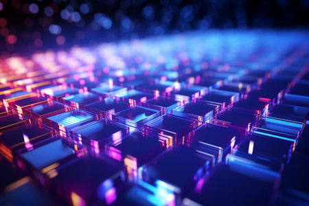 This striking abstract image features illuminated blocks arranged in a grid-like pattern, showcasing a blend of technology and modern design elements.