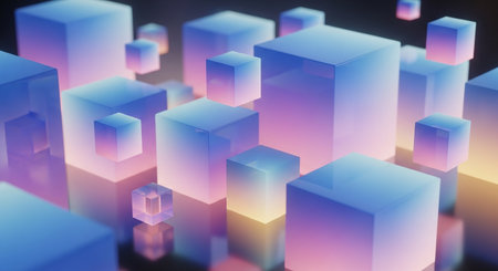 A sleek 3D abstract background featuring floating transparent cubes glowing with soft neon reflections. The high-tech futuristic atmosphere is enhanced by seamless gradients and intricate details.