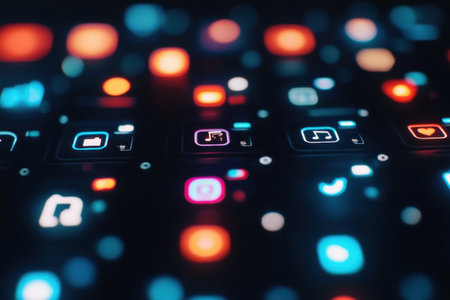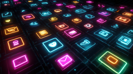 A stunning arrangement of colorful neon icons on a dark background, showcasing modern technology and communication elements, perfect for creative and digital projects.