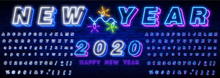Neon sign happy new year 2020 on a dark background with bright alphabets.