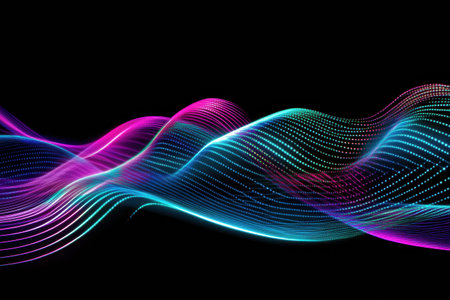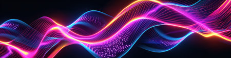 An abstract digital illustration showcases a flowing wave design, rendered in vibrant neon colors against a dark backdrop. The composition features dynamic lines and curves, creating a sense of movement and energy. Suitable for use in various visual communications, the design offers potential applications in modern design and technological projects.