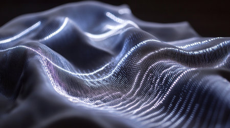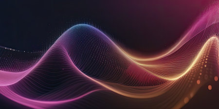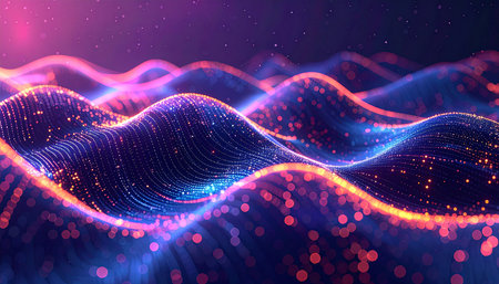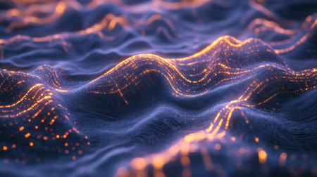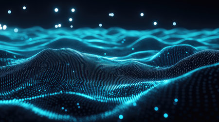 Abstract digital wave background with glowing particles in dark scene