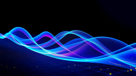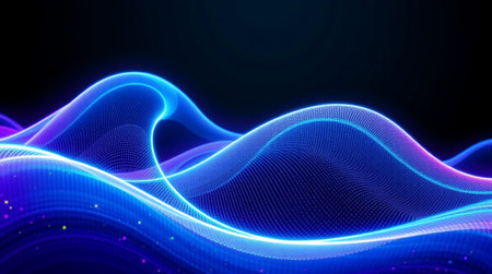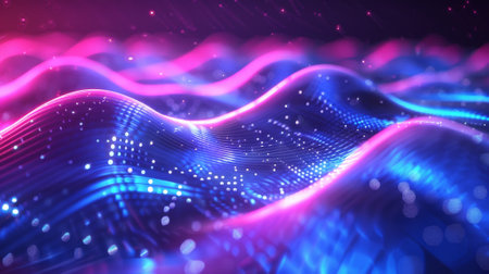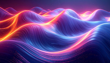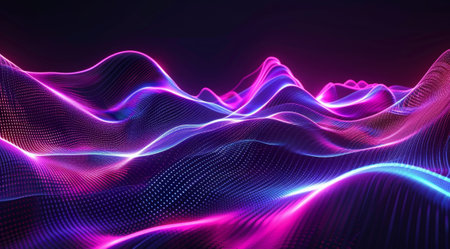 This captivating image showcases abstract digital waves illuminated by vibrant neon colors. The flowing lines create an engaging visual experience, perfect for technology and futuristic themes.