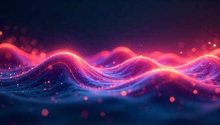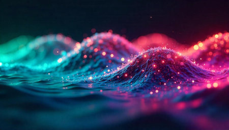 Abstract glowing ocean waves with vibrant colors and bokeh