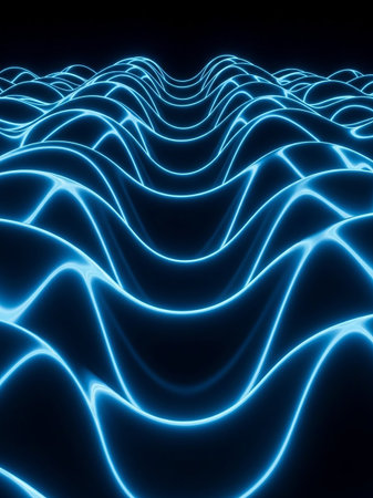 A landscape of undulating, glowing blue neon waves creates a dynamic and futuristic abstract background on a dark surface.
