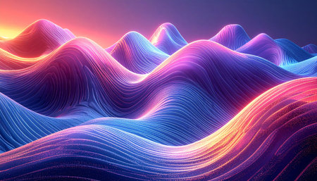 Abstract undulating landscape with glowing neon lines in purple, blue, and orange hues.