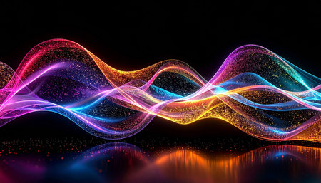 Abstract glowing neon waves in orange, yellow, blue, and purple with glitter particles reflected.